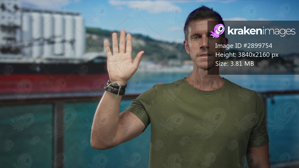 Man with hand raised in greeting on boat deck by railing and ship in harbor wearing olive green shirt and leather bracelets; calm goodbye.