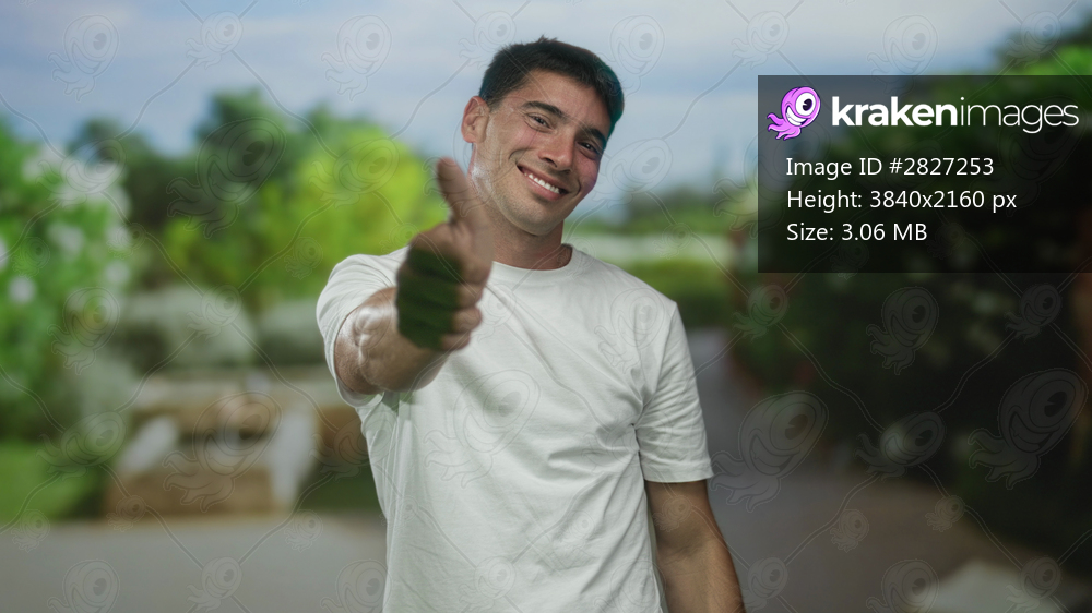 Man hand showing thumbs-up gesture on street by green foliage; approval encouragement positivity confidence.