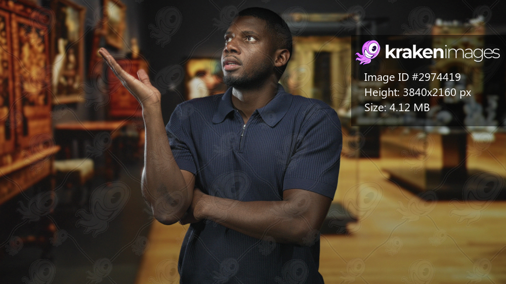 Man with hand to chin thinking, folded arms and polo shirt in museum gallery with paintings and displays; contemplation curiosity.