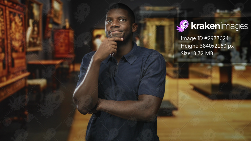 Man with hand to chin thinking, folded arms and polo shirt in museum gallery with paintings and displays; contemplation curiosity.