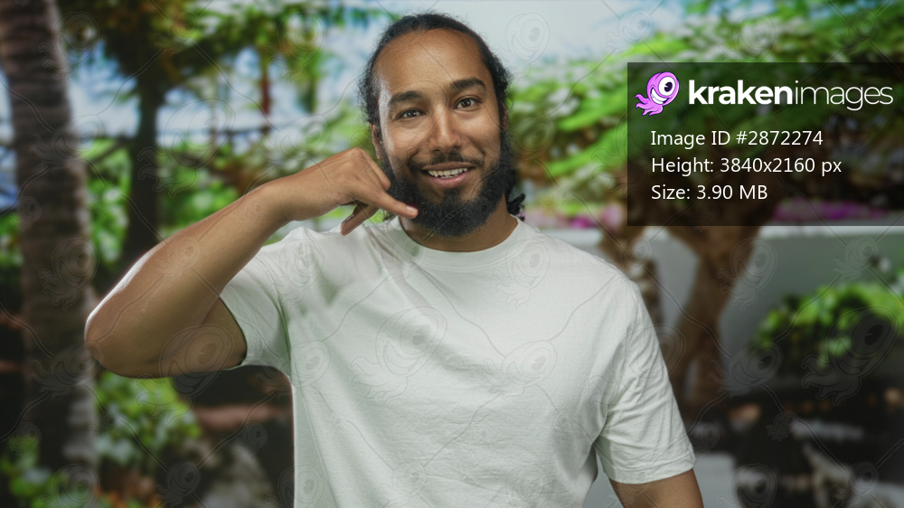 Man with hand to ear for call and pointing finger in forest with green foliage and white t shirt; friendly connection.