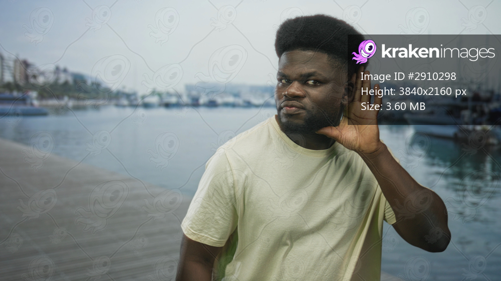 Man with hand to ear and thumbs up on a building pier at the seaside port, boats visible; curiosity connection.