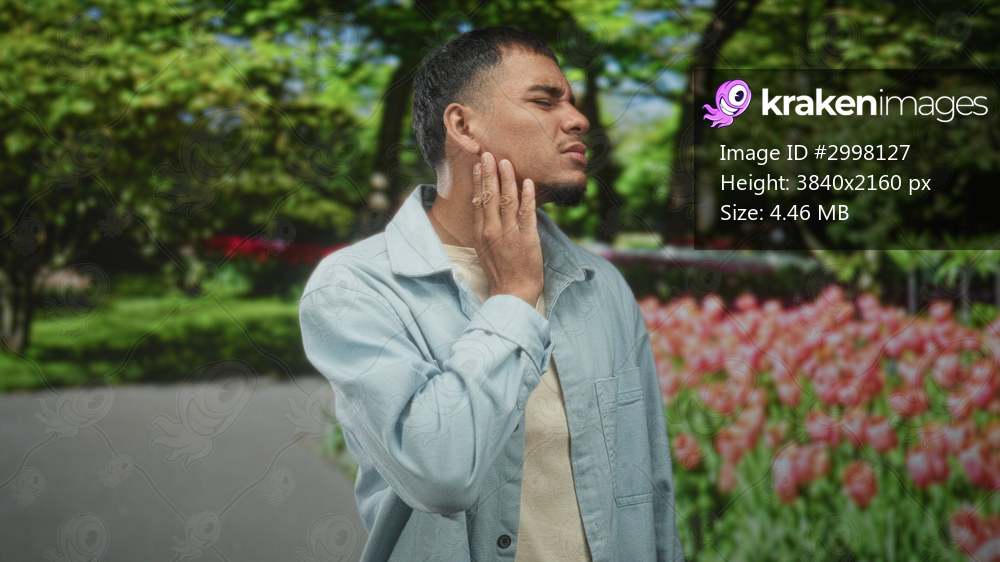 Man with hand to ear wincing beside a tulip bed on a park path in a forest setting, wearing denim jacket and beige shirt; pain.