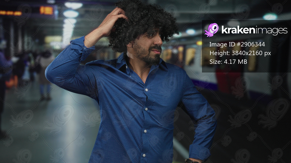 Man with hand to hair wearing blue shirt on crowded train platform inside building; travel confusion.