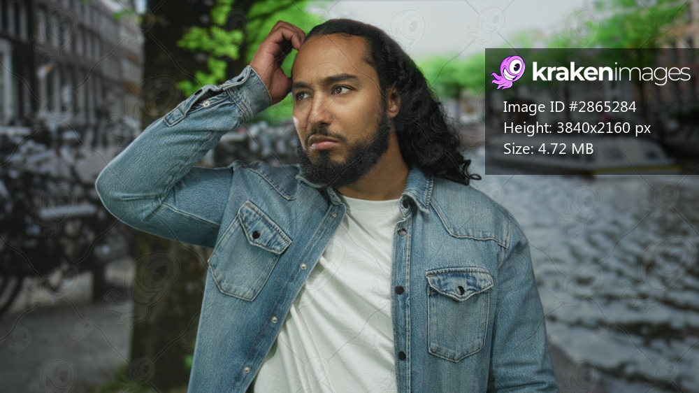 Man with hand to head beside a canal boat on an amsterdam street, looking thoughtful; pensive reflection.