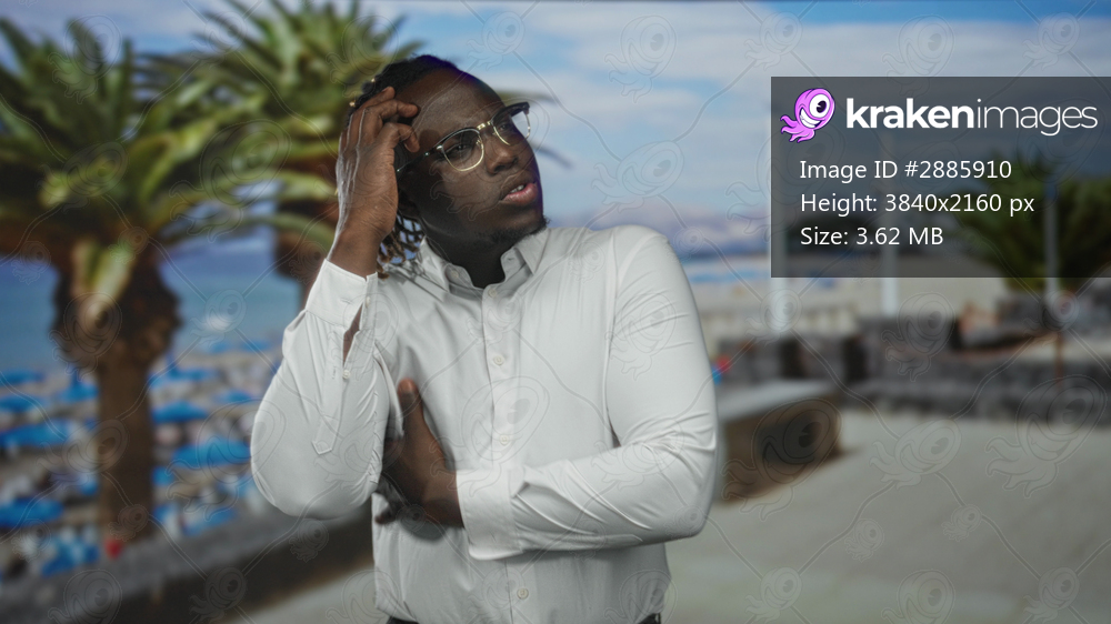 Man with hand to head and visible face at beach, wearing white shirt and glasses, looking upward toward sky; confidence reflection.