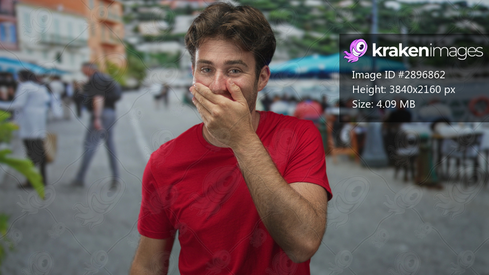 Man with hand to mouth smiling at outdoor waterfront restaurant terrace, red t shirt visible, forearm and hand exposed and centered in frame; surprise. - Kraken Images