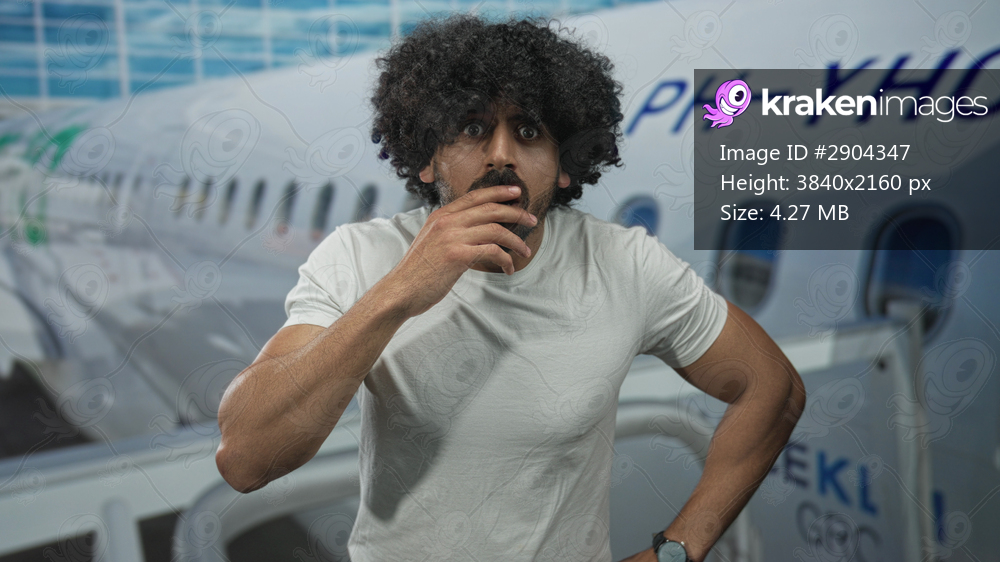 Man with hand to mouth and wide eyes standing by airplane boarding stairs at airport terminal; surprise.