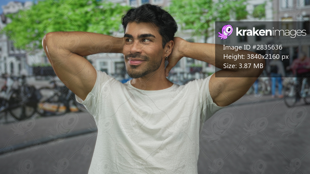 Man with hands behind head on sunny urban street lined with bicycles and trees; peaceful solitude.