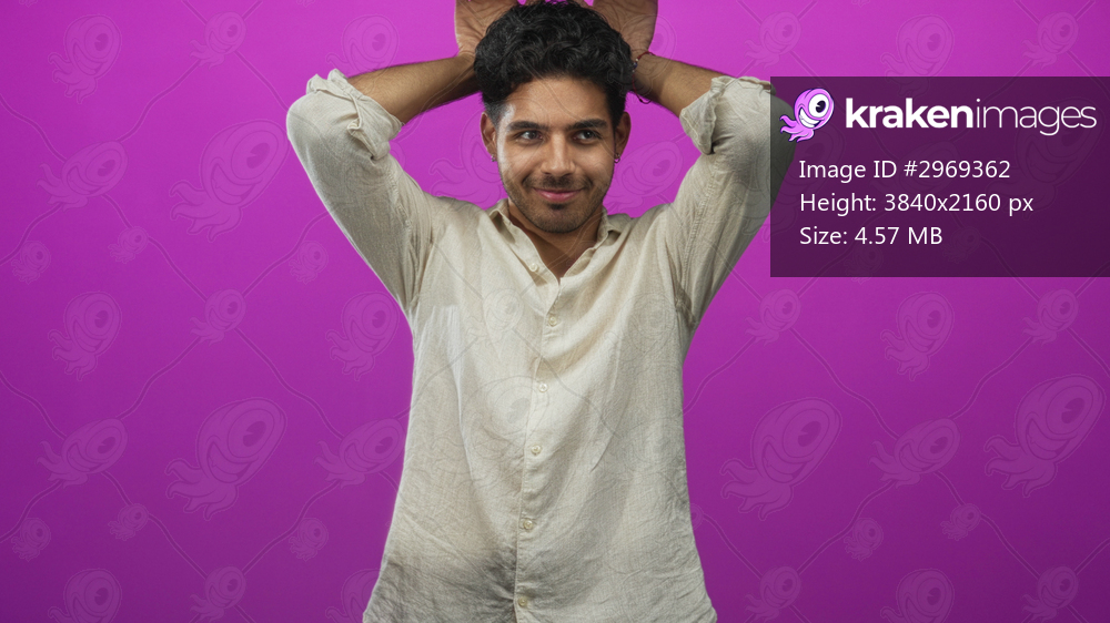 Man with hands behind head smiling, wearing a beige linen shirt with rolled sleeves and earring, standing against a purple studio wall; casual confidence. - Kraken Images