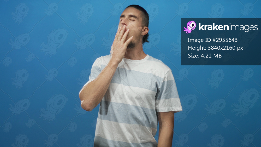 Man hands behind head stretching in studio, striped white and light blue t shirt lifted to reveal bare abdomen and relaxed facial squint against blue backdrop; relaxation ease. - Kraken Images