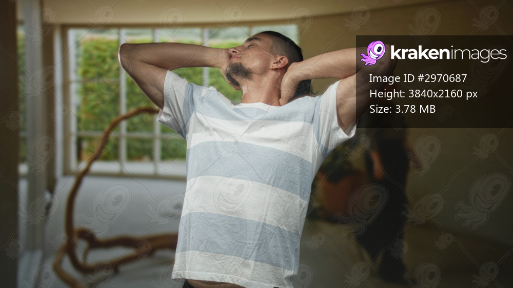 Man with hands behind neck stretching by a large window and driftwood sculpture in studio; calm reflection.