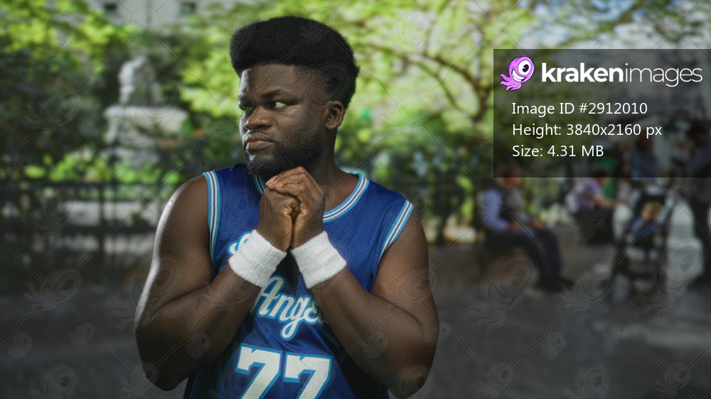 Man with hands clasped at chest wearing a blue basketball jersey and wristbands on a street near park benches and trees, tense expression visible; determination resilience perseverance. - Kraken Images