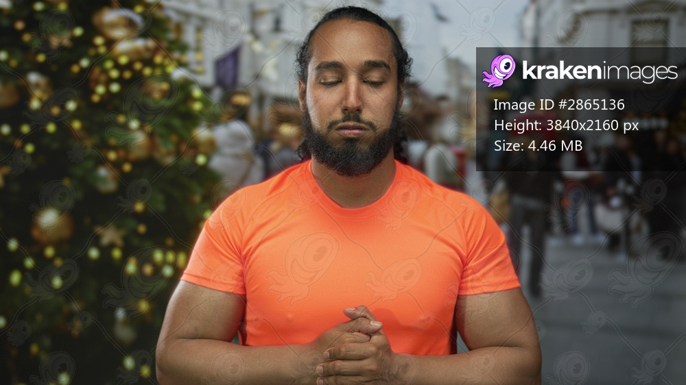 Man with hands clasped and eyes closed in orange shirt on street by christmas tree and crowded shoppers; calm reflection.