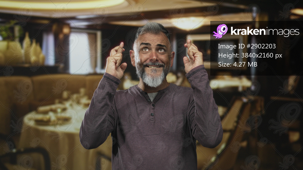 Man with hands clasped and fingers crossed in a restaurant building, smiling broadly and pleading with closed eyes while standing near table; hope.
