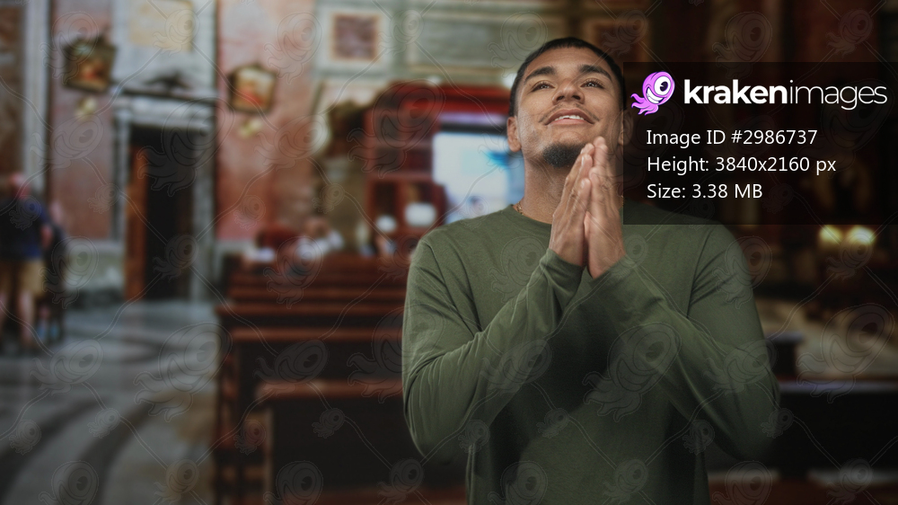 Man with hands clasped in prayer inside ornate church nave, smiling gently in green shirt; reverence faith.
