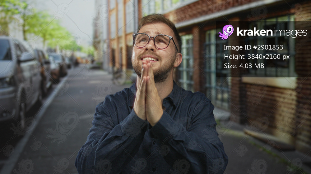 Man with hands clasped in prayer looking up on a street beside brick building and parked cars; hope faith.