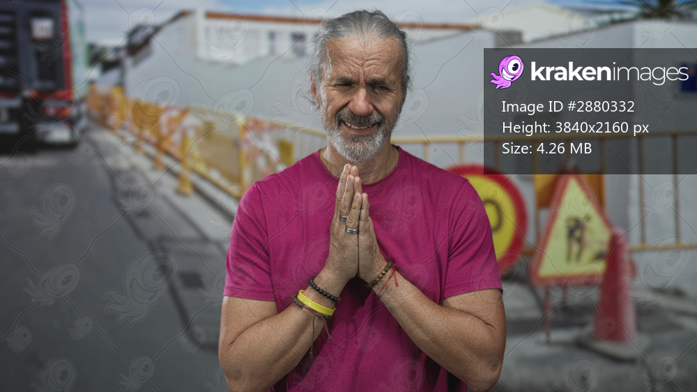 Man with hands clasped in prayer on a street by construction barriers and traffic signs, looking upward; hope.