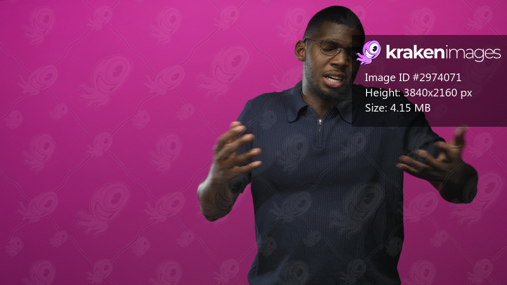 Man with hands clasped near chest, wearing glasses and dark polo, gesturing subtly against magenta studio backdrop; quiet contemplation.