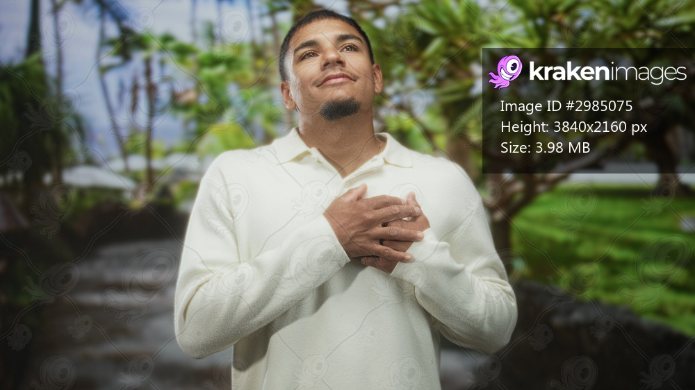 Man with hands clasped over chest in forest pathway among palm trees and stone walkway, wearing white sweater, looking upward in thankful pose; gratitude peace. - Kraken Images