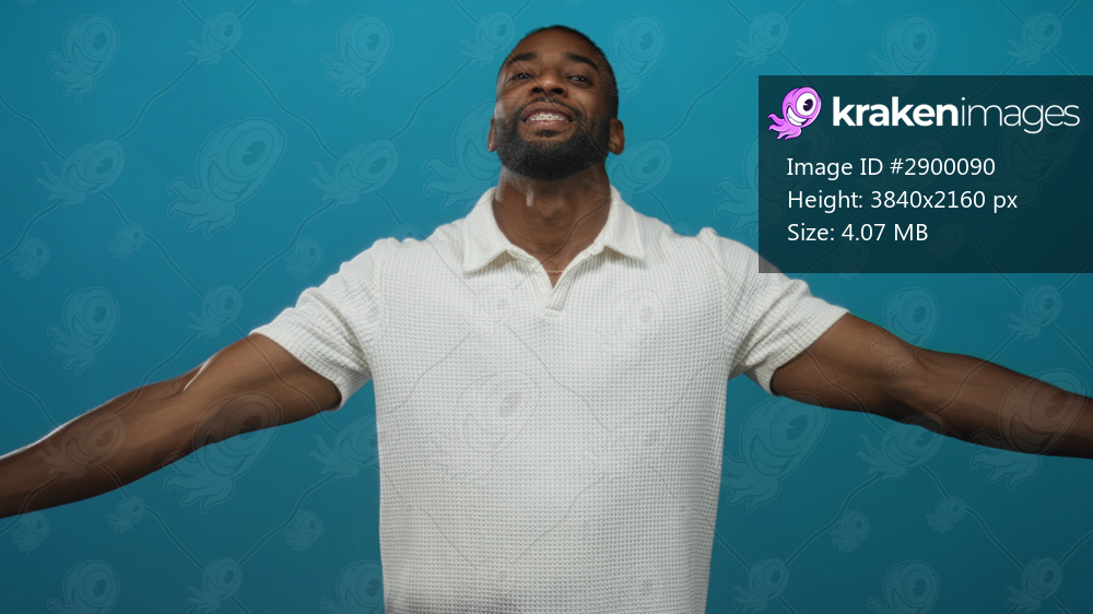 Man with hands clasped over chest and open smile in studio with blue backdrop wearing white polo and bracelet; gratitude openness joyful.