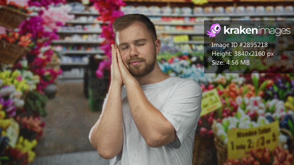 Man with hands clasped to cheek in colorful flower market stalls on street, smiling gently; serenity.
