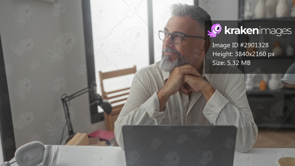Man with hands clasped under chin at desk with laptop in building home office; quiet contemplation and focused reflection.