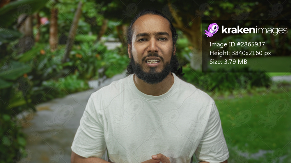Man with hands clasped and worried face speaking on a park path in forest with green foliage and lawn; concern sincerity.