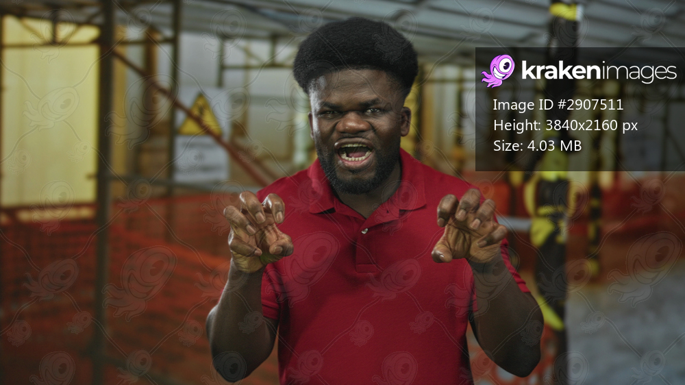 Man with hands clawed and grimacing inside a building construction site wearing a red polo shirt and showing bare fingers and hands; playful energy.