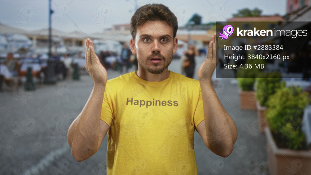Man with hands covering eyes on a crowded street market, wearing a yellow t shirt with visible text; embarrassment.