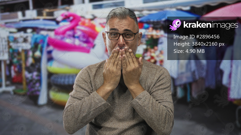 Man with hands covering mouth blowing a kiss in street market stalls and souvenirs; playful greeting.
