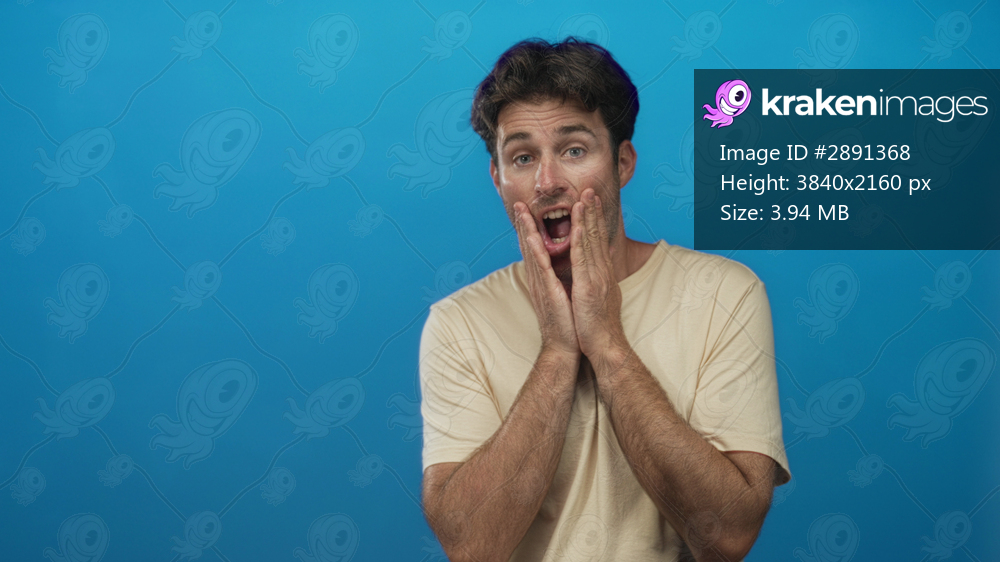 Man with hands covering mouth in blue studio, beige tshirt, visible stubble and wide open mouth showing shock gesture; surprise.