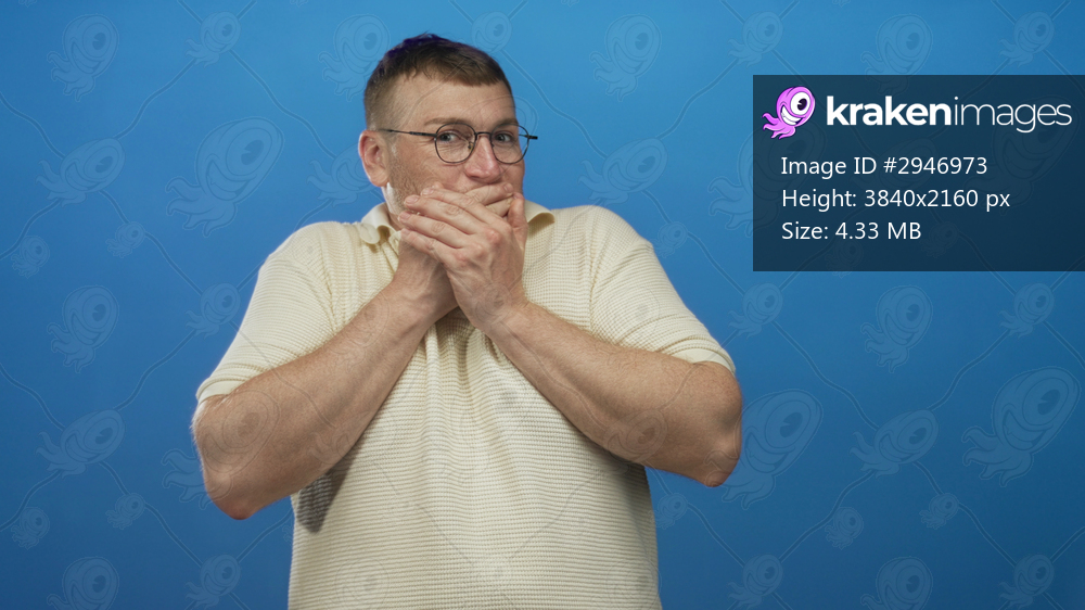 Man with hands covering mouth in blue studio wearing beige shirt and round glasses; surprise silence hush.