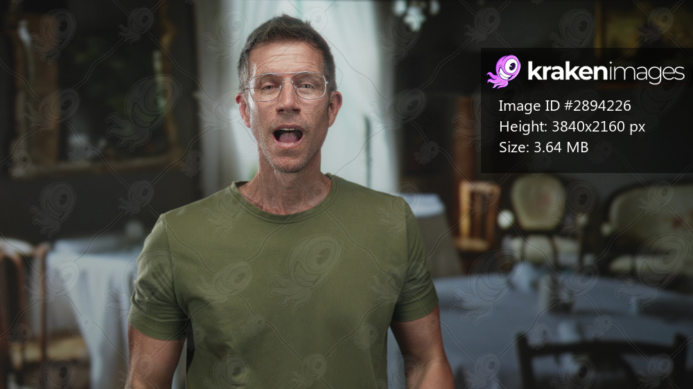 Man with hands covering mouth in restaurant building, wearing glasses and olive green t shirt, palms visible; surprise.