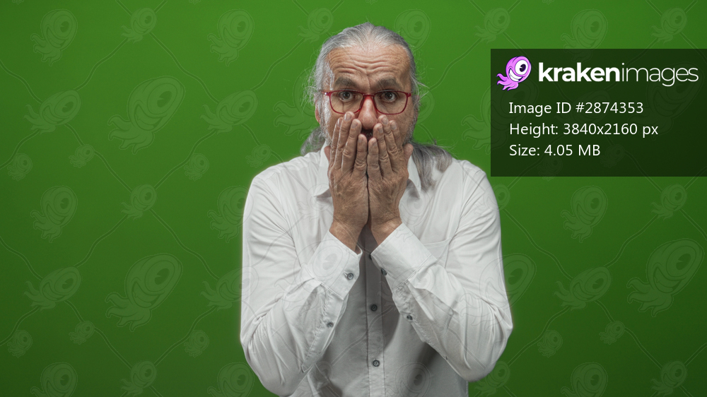 Man with hands covering mouth and red glasses in green studio, middle age with long hoary hair wearing white shirt facing camera; surprise.