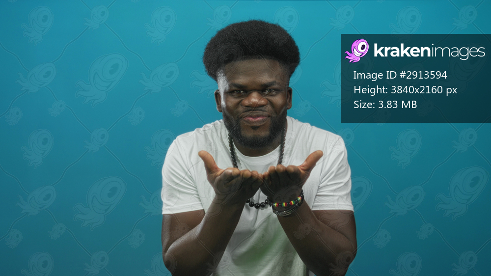 Man with hands covering mouth then open palms offering toward camera, wearing white t shirt and beaded necklace, posed against a blue studio wall; inviting. - Kraken Images