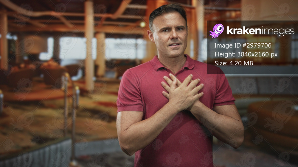 Man with hands crossed over chest at an airport terminal, smiling, wearing a red polo shirt; gratitude reflection.