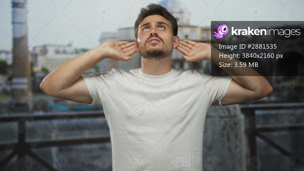 Man with hands cupping ears at building ruins on an outdoor balcony, looking upward and tensing shoulders; frustration focus.