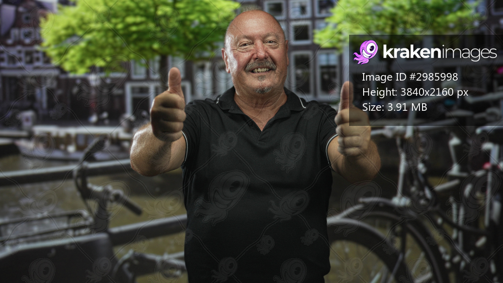 Man with hands forward giving thumbs up and smiling on a canal street by bicycles and bridge; joy celebration.