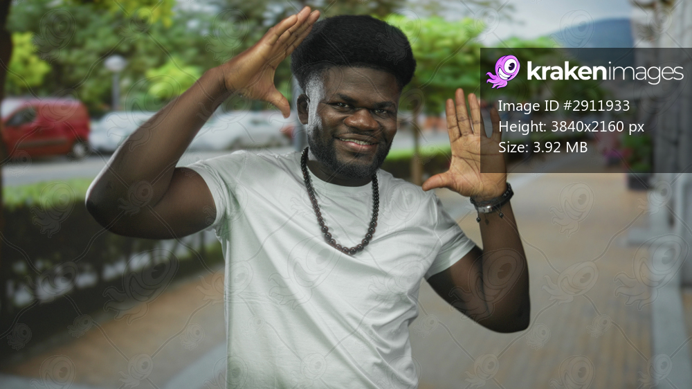 Man hands framing face smiling on a busy city street, wearing white t shirt and necklace while gesturing; confidence creative expression.