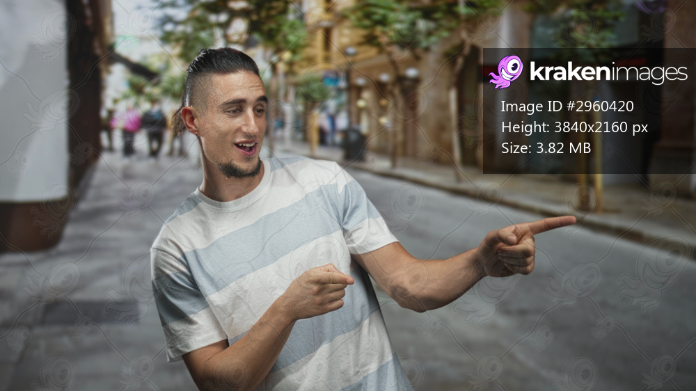 Man hands gesturing and pointing on a busy street, smiling and talking while wearing a striped tshirt; playful conversation.