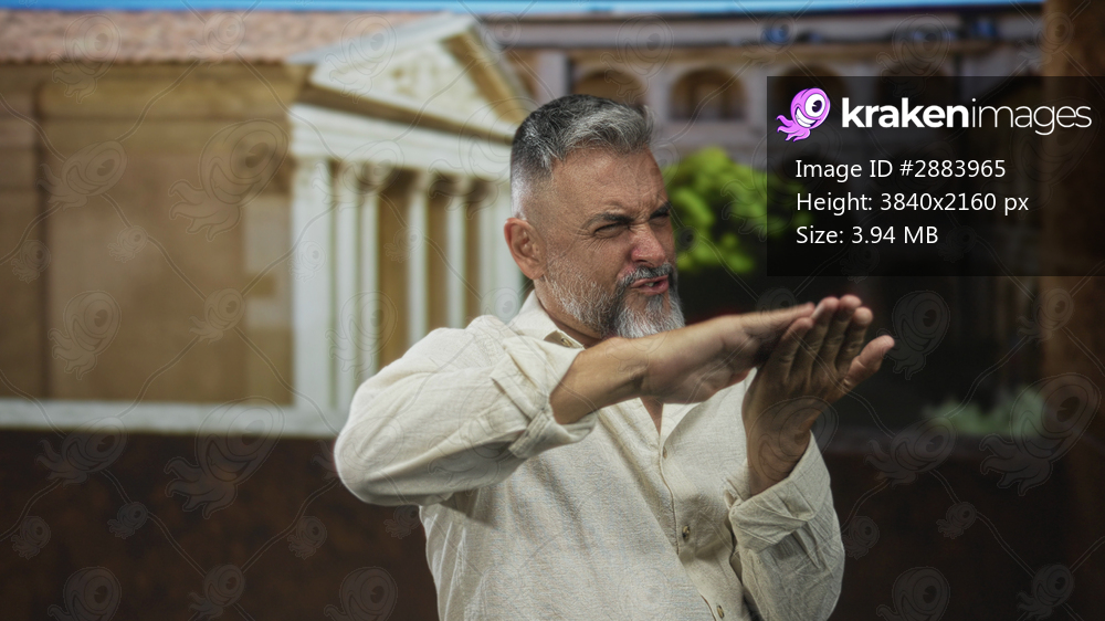 Man with hands held flat in front of face on old town street with classical building; disgust rejection.