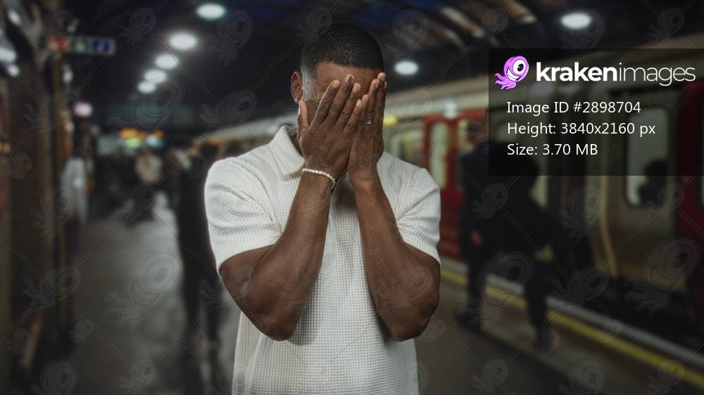 Man with hands held forward for stop gesture on station platform inside building with train behind; concern safety.