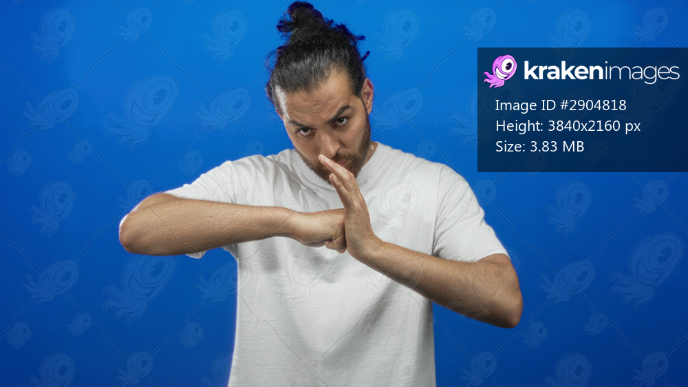Man with hands in a defensive martial pose wearing a white t shirt in a bright blue studio, visible forearms and focused gaze; determination.