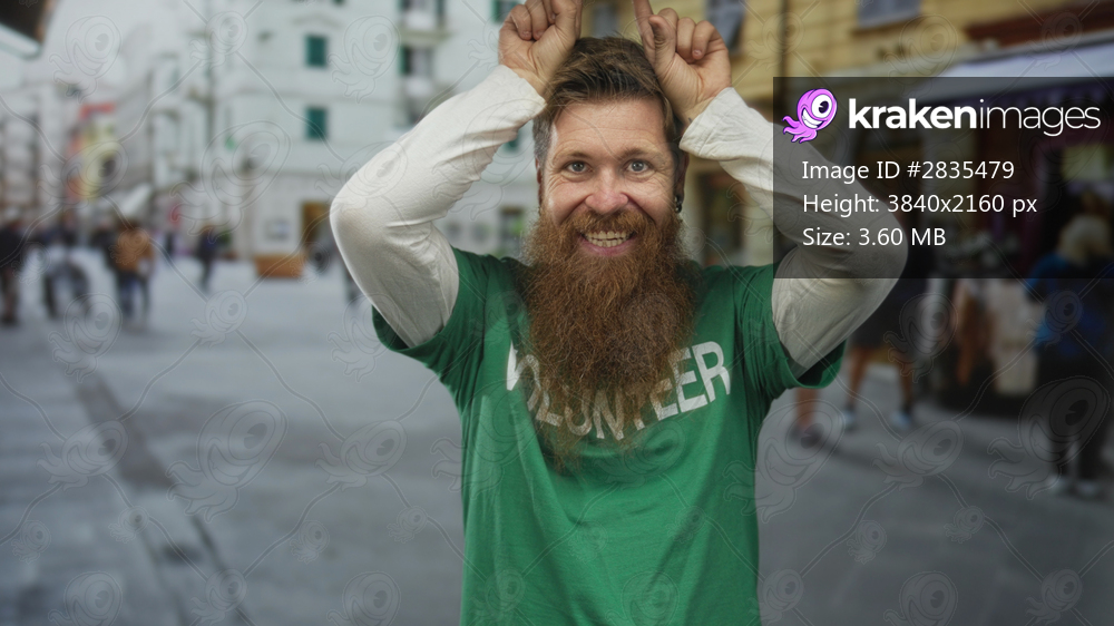 Man hands making horns gesture over head while smiling on green volunteer shirt in busy city street; cheerful playfulness.