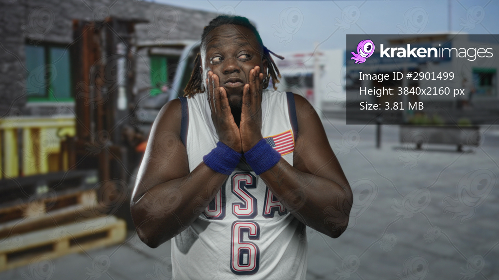 Man with hands on cheeks for toothache on street wearing usa jersey and wristbands; concern reflection.