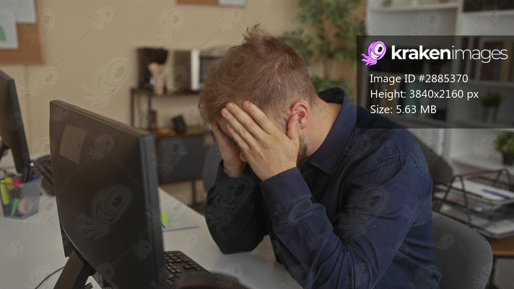 Man with hands on cheeks removing glasses while staring at computer monitor at desk inside building; stress concentration.