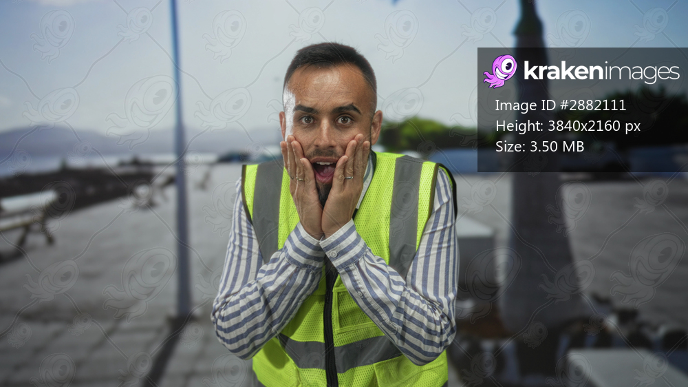 Man with hands on cheeks showing surprise in street wearing reflective vest and striped shirt; safety alert surprise.