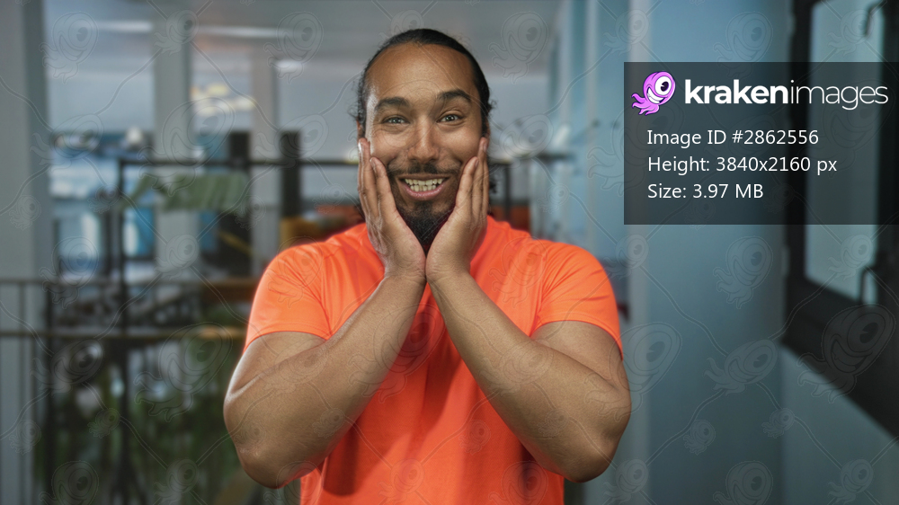 Man with hands on cheeks touching face in hotel lobby wearing bright orange shirt and smiling; surprise welcome.