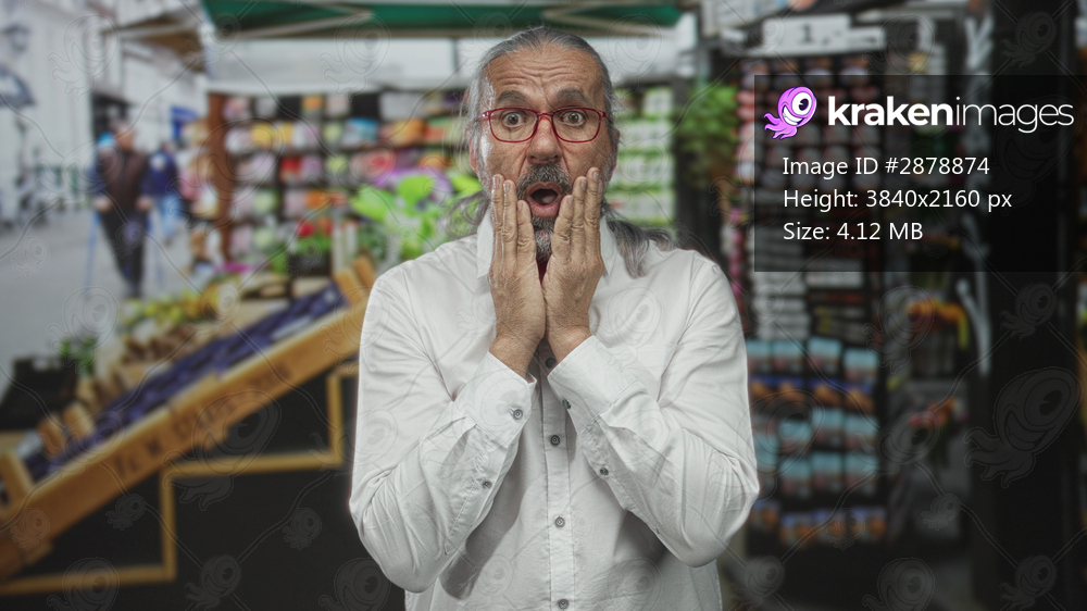 Man with hands on cheeks wearing red glasses at a crowded street market souvenirs stall, mouth open in shock; surprise curiosity wonder.
